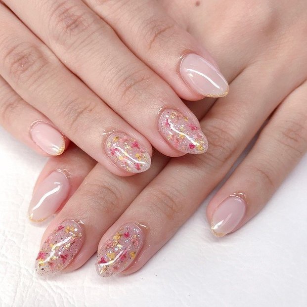 フラワーネイルを取り入れれば、コーディネート全体の春らしいムードがアップします。透明ネイルデザインで取り入れることで、大人シンプルな春のトレンチスタイルに印象づけることができますよ。