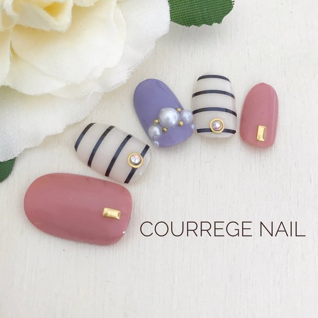 トレンチコートとボーダーデザインは相性のいい組み合わせ。くすみピンクとパープルカラーを取り入れたネイルデザインなら、より旬な春コーデに仕上がります。