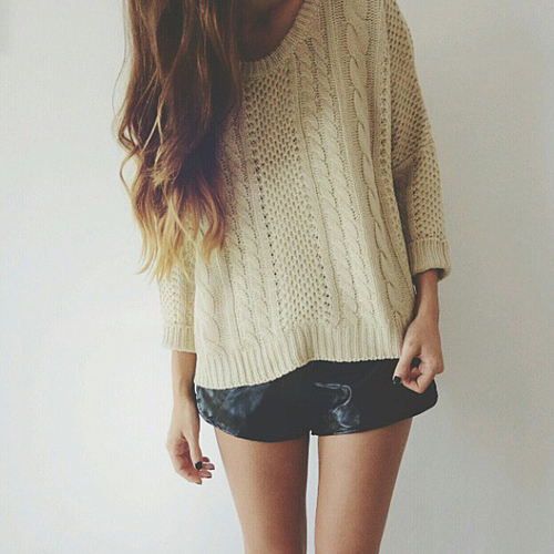 ニットの裾から見えるチラ見えレザーは控えめな可愛さ