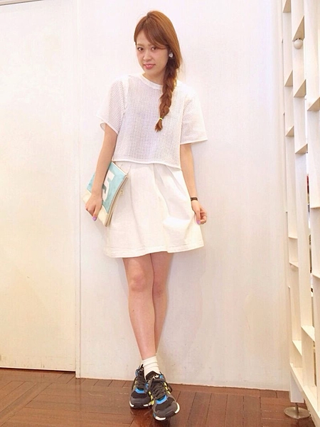 白デニムのフレアスカートで作るオールホワイトの着こなしです。