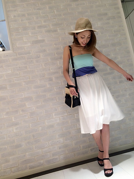 スカイブルーの肩掛けカーデでセレブな着こなし♡