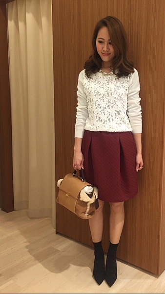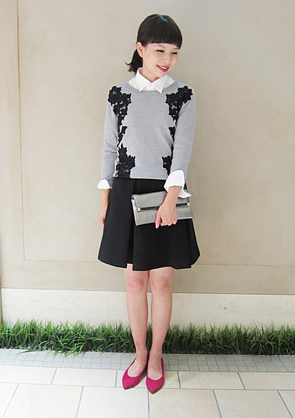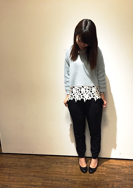 ベーシックな形のニットの下にカッティングレースがちらり。パンツスタイルにも、タイトなスカートにもよく合いますよ。