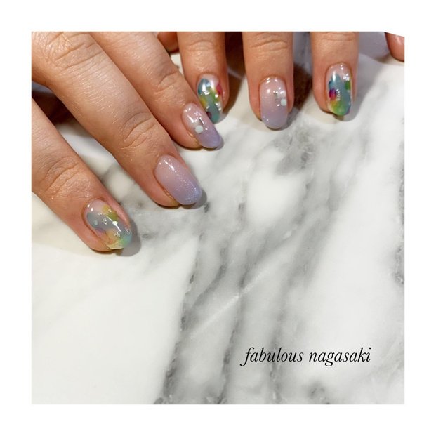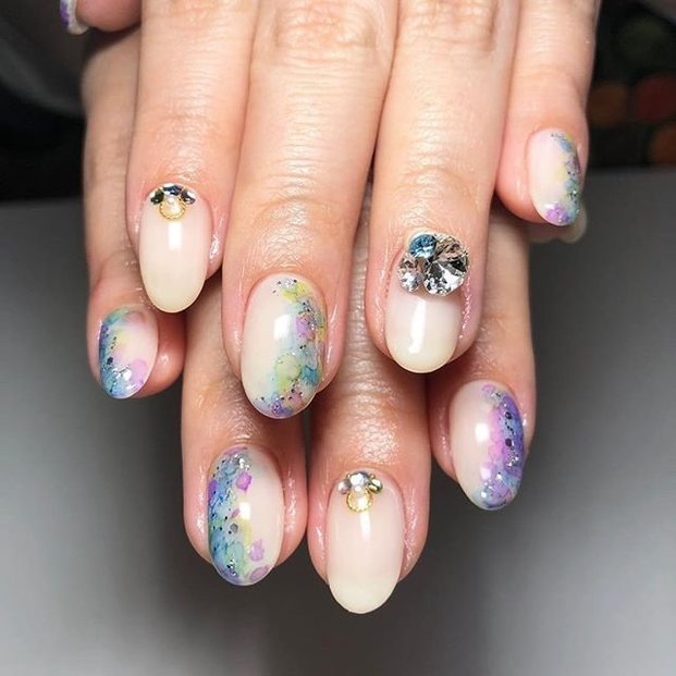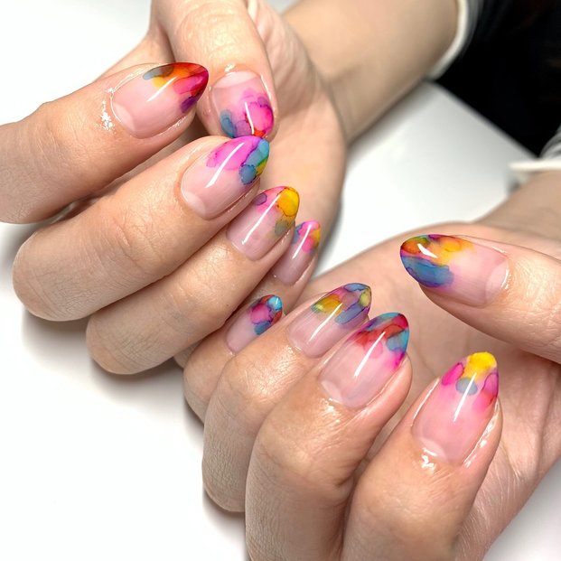 派手なカラフルネイルも、たらしこみネイルなら上品に仕上がります。透け感のあるネイルカラーで取り入れれば、つや感のあるオシャレなネイルに。