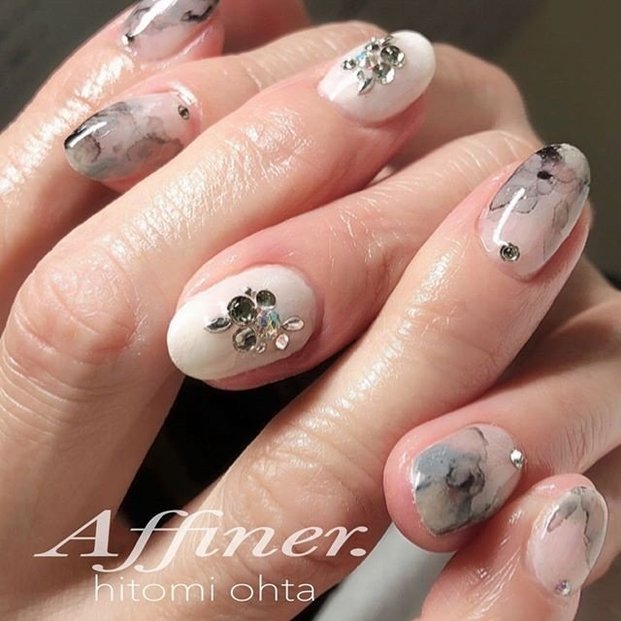 モノトーンカラーのたらしこみネイルは、年齢問わず楽しめるデザインです。個性的になりがちなモノトーンカラーのネイルは、たらしこみネイルなら優しく女性らしい雰囲気でまとまります。