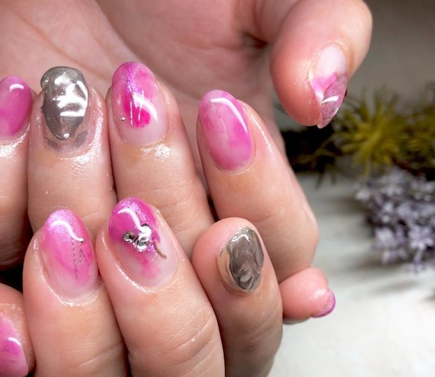 子供っぽくなりがちなピンクカラーのネイルは、シルバーカラーを取り入れることで大人な仕上がりに。指先を中心にたらしこみネイルを取り入れることで、品のある指先にまとまりますよ。