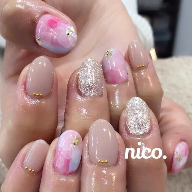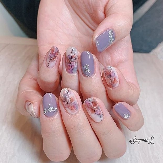 同じたらしこみネイルもブルージュカラーを取り入れれば、落ち着いた雰囲気で取り入れることができます。 ピンクやオレンジなどのカラーを取り入れたたらしこみネイルは、ロマンティックな手元を演出してくれますよ。