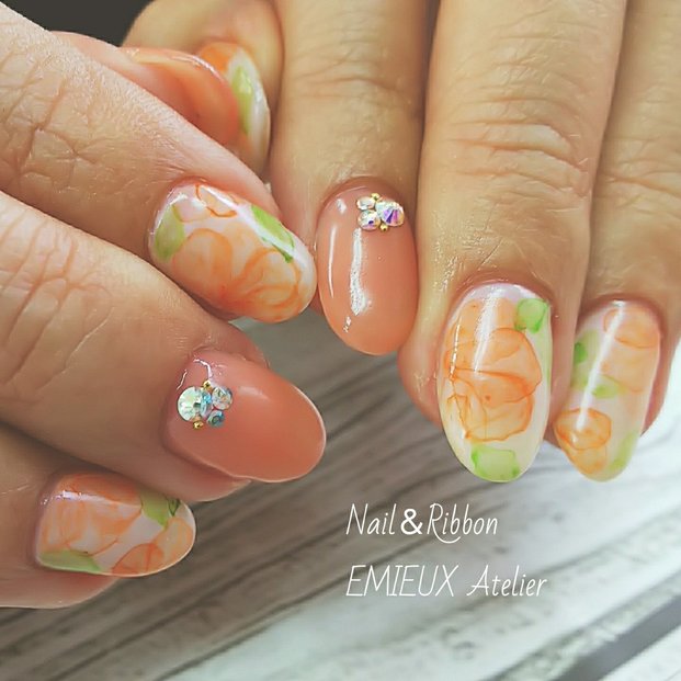 オレンジカラーのたらしこみネイルは、フレッシュな手元を目指せるデザインです。明るいオレンジなら、たらしこみデザインもフェミニンに楽しめますよ。
