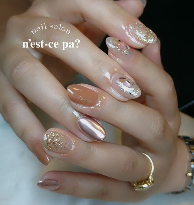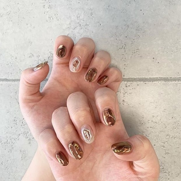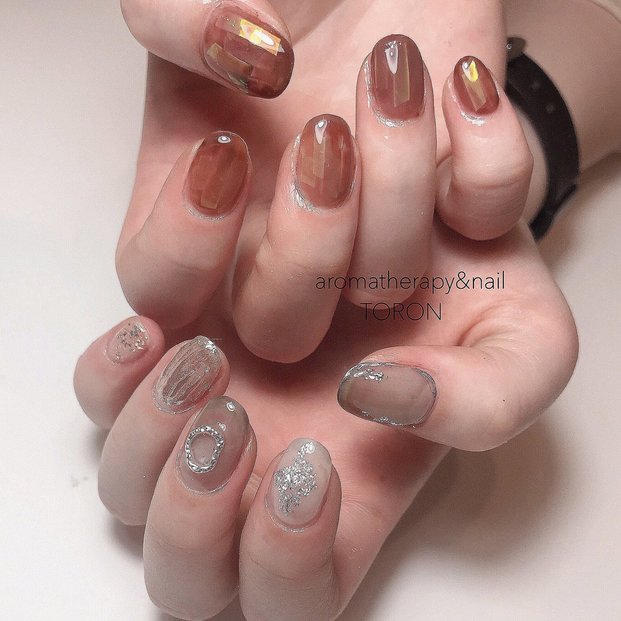 老け見えしがちなブラウンカラーのネイルは、ゴールドやシルバーを合わせることでワンランク上の仕上がりに。シアーなカラーなら、手元からフェミニンな色気が滲み出ます。