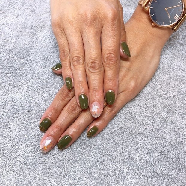 クリアカラーのネイルをポイントで合わせることで、カーキネイルも爽やかな印象に。ダークになりがちなカーキカラーを、夏らしく軽やかに楽しむことができるデザインです。