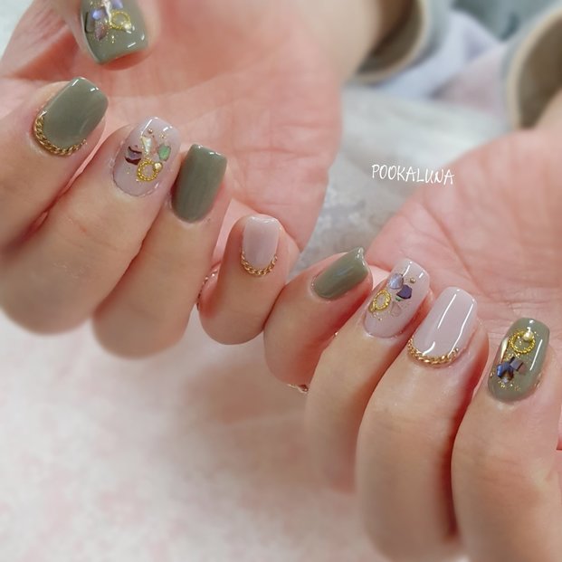 くすみカラーのカーキ×白味ピンクの甘辛MIXメイル。ゴールドパーツやシェルパーツを合わせれば、ちょっぴりリッチな雰囲気を演出できます。