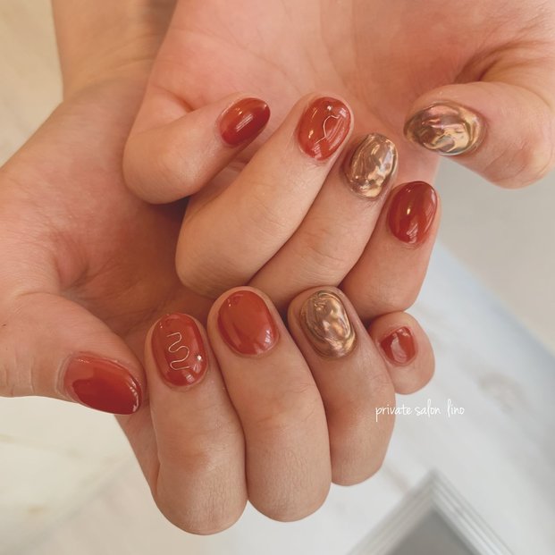 オレンジブラウンカラーのネイルデザインなら、グッと華やかな印象に。ゴールドミラーカラーを合わせれば、ちょっぴりモードな夏ネイルの完成です。