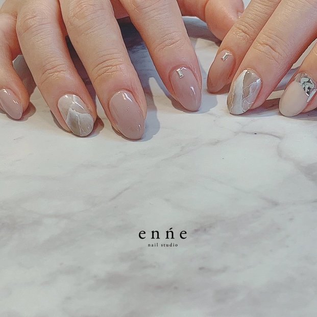 ベージュカラーのネイルは、シルバーパーツを取り入れることで地味になりすぎずエレガントにこまとまります。大理石デザインをあしらえば、洗練された印象の上品ネイルに。