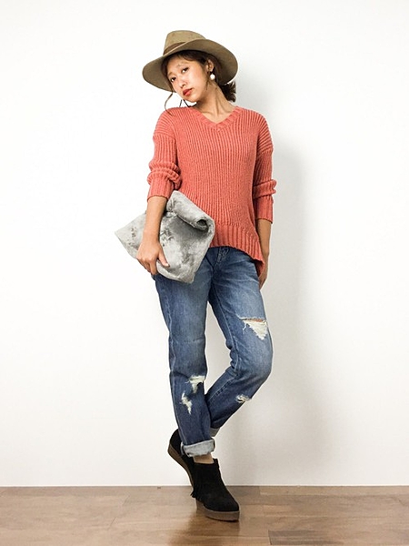 明るいオレンジニット×クラッシュデニム