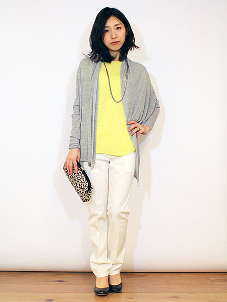 女らしいペンシルスカートとシンプルなカットソーのセットアップ。ベーシックなアイテムの組み合わせで、それぞれアレンジが楽しめそう。