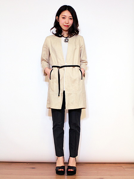メランジ感がクラシカルなデザインにマッチする上品なセットアップ。スタンドネックに配したリボンが大人可愛い雰囲気です。