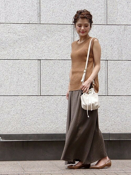キャメルのノースリーブトップスに合わせるのは