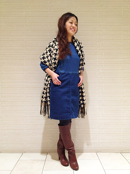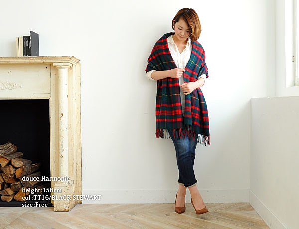 チェック柄のストールは、巻くだけでなく羽織っても可愛くきまるファッション小物。大判ストールは首回りに持っていきトップにボリュームをプラスしてもバランスよくきまりますよ。