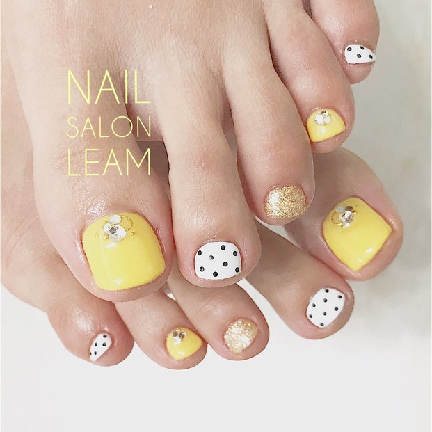モノトーンのドット柄×イエローの組み合わせが印象的なフットネイルデザインです。定番の白黒ドット柄も、鮮やかなイエローを主役にするだけで夏感が急上昇!