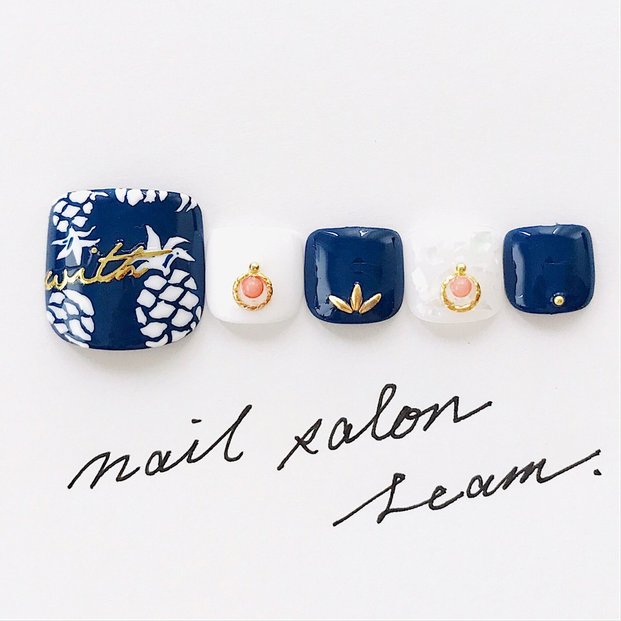 夏といえばのパイナップル柄は、白×ネイビーの大人配色でリッチな印象に♡ゴールドパーツをのせて引き締めれば、ワンランク上のトロピカルネイルが完成します。