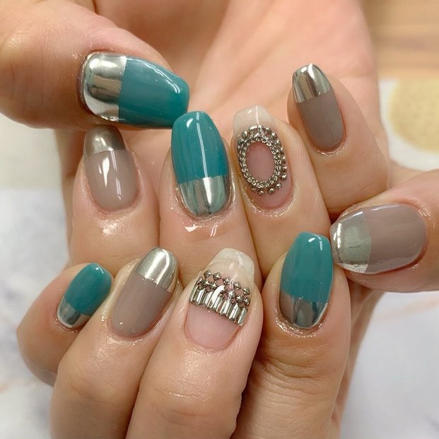 個性的になりがちなグリーンカラーネイルは、バイカラーで取り入れることで個性を中和。ミラーカラーを合わせることで、スタイリッシュなネイルデザインにまとまります。