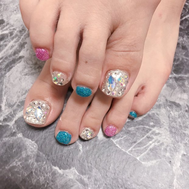 ピンクカラーを加えれば、可愛らしい印象のフットネイルに。ブルーやピンクのシェルを取り入れることで、トレンド感のあるビジューネイルにまとまります。
