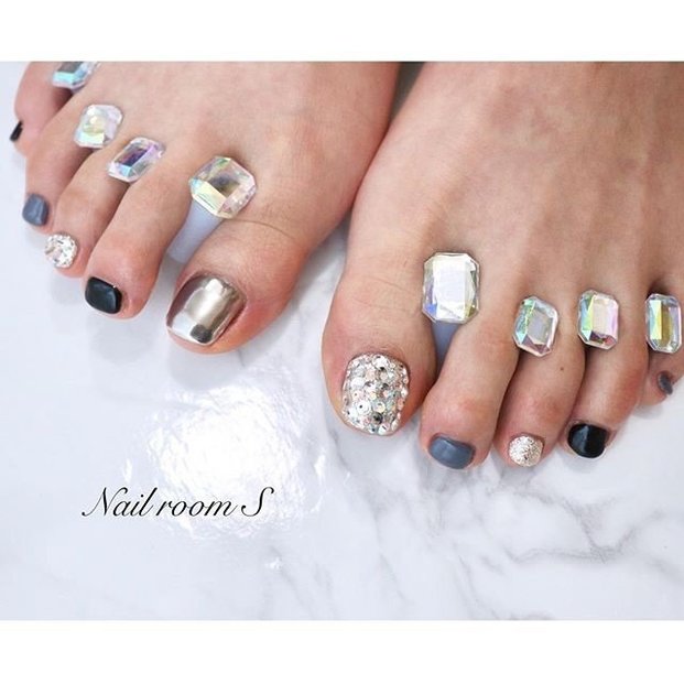 あえてのモノトーンカラーで統一すれば、スタイリッシュな足元にまとまりますね。ミラーネイルでさりげなくトレンドをキャッチ♡