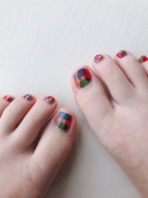 派手めのデザインが苦手な人も、目立たないペディキュアは遊び心があるデザインを楽しめるのがいいですよね。色々なカラーを混ぜて塗るとオシャレな雰囲気に仕上がります。こっくりとしたシックな色合いを選べば秋ファッションにも合うデザインに。
