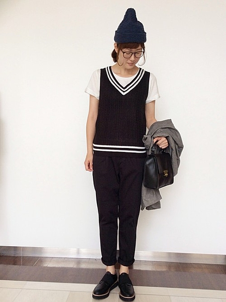 春からずっと人気のベストもマニッシュコーデには欠かせない存在。