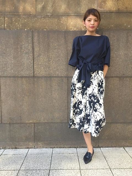 大人っぽいネイビーコーディネート。リボンブラウスはオフィスでも使える優秀アイテム。