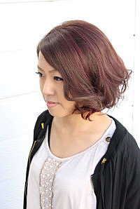 カラーはピンクパールと、クランベリーブラウンをミックスして輝きを。ナチュラルなパーマで抜け感を表現。
