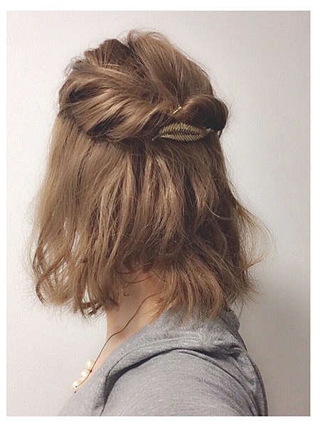 1.顔まわりは降ろしたままで、その後ろのバックのトップをハーフアップするように少し低めの位置で結びます。