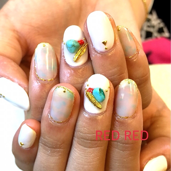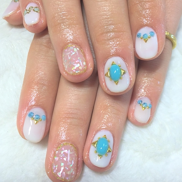 ホイルネイルにブルーとグリーンのストーンを置いてポイントに。