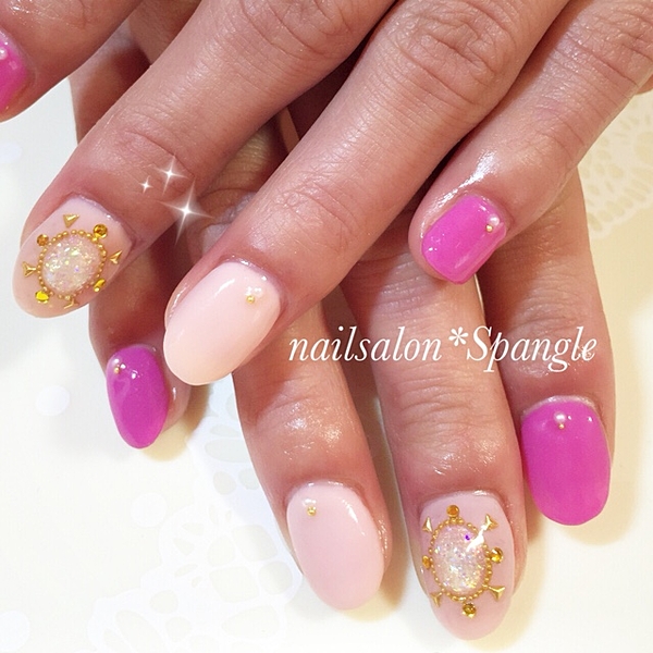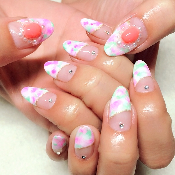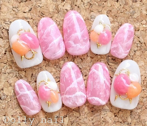 大きなピンク・白・オレンジのストーンを並べれば爽やかな女の子らしいストーンネイルに!