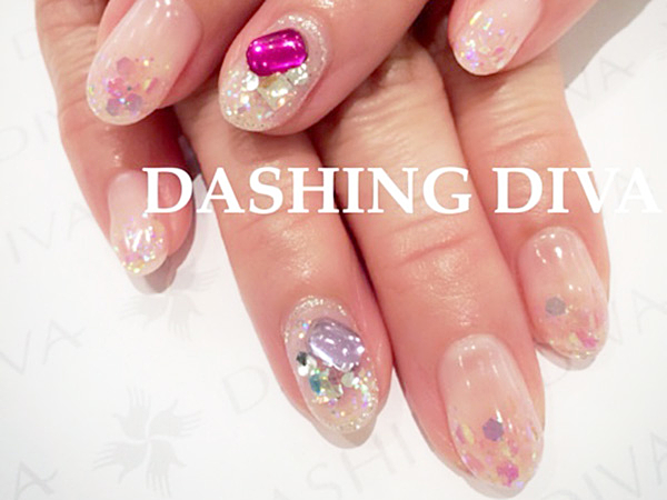 クリア感のあるにオーロラのネイルのホワイトとピンクの大きなストーン。