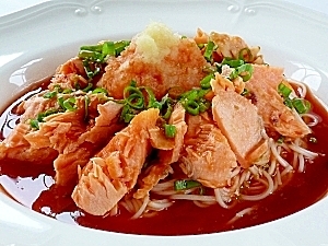 楽天レシピ:「焼鮭の冷たいトマトジュースおろしそうめん 」より