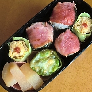 【今日の弁当】 おにぎり3種(うめ、しゃけ、おかか) 切り干し大根入り卵焼き 揚げ物 えのきとベーコンのソテー おくらのごま和え http://t.co/z4JwPucooG