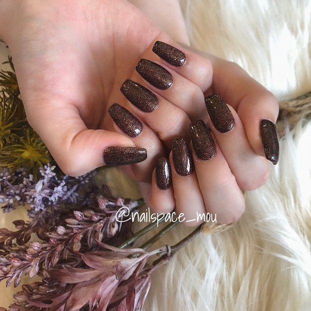 濃いめのブロンズカラーで、モードな印象のネイルデザインにチャレンジ。細やかなラメデザインのネイルカラーなら、高級感のある指先にまとまります。