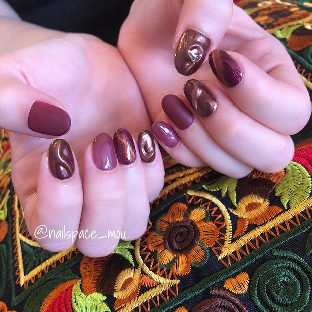 シックなブロンズネイルは、ボルドーカラーとかけ合わせれば、レディな印象のネイルに仕上がります。ニュアンスの違うボルドーと合わせることで、おしゃれで女性らしい指先に。