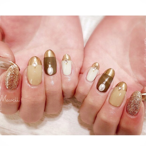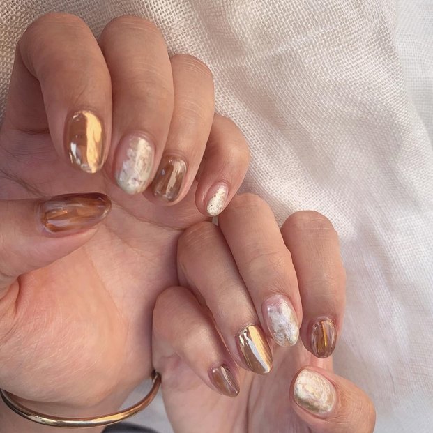 個性的なブロンズカラーは、ベージュやホワイトなどのニュアンスネイルを取り入れることで優しげにまとまります。シアーなカラーのネイルかけ合わせれば、ツヤ感のあるネイルが楽しめますよ。
