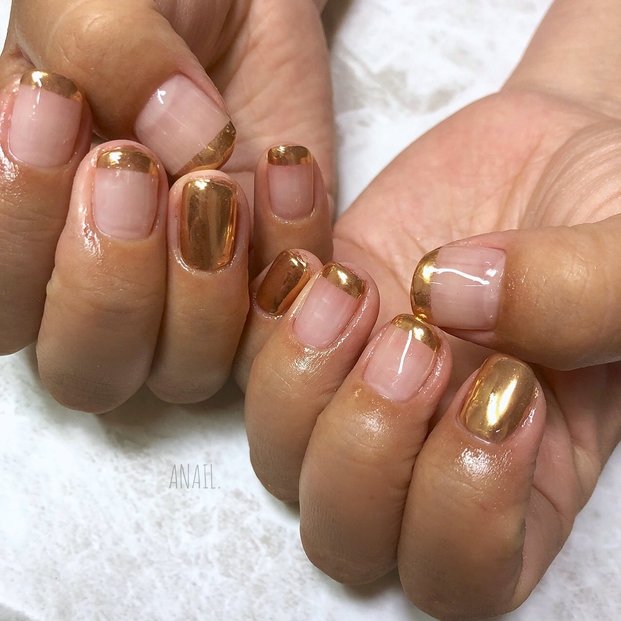 ブロンズネイルをフレンチデザインで取り入れれば、カジュアルな印象のネイルに仕上がります。透明ネイルを合わせれば、ツヤ感のあるリッチな手元に。