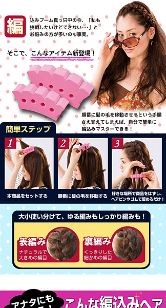 全国の不器用さんよ。あなた方の憧れへアー”編み込み”が簡単にできちゃう㊙アイテムがあるんです!これさえあれば、不器用なあなたでも表編み込み、裏編み込みも自由自在。髪型に気を抜かないおしゃれさんの仲間入りすることができちゃいます。さあ、今すぐGETだ~~!!
