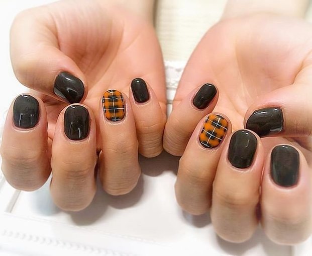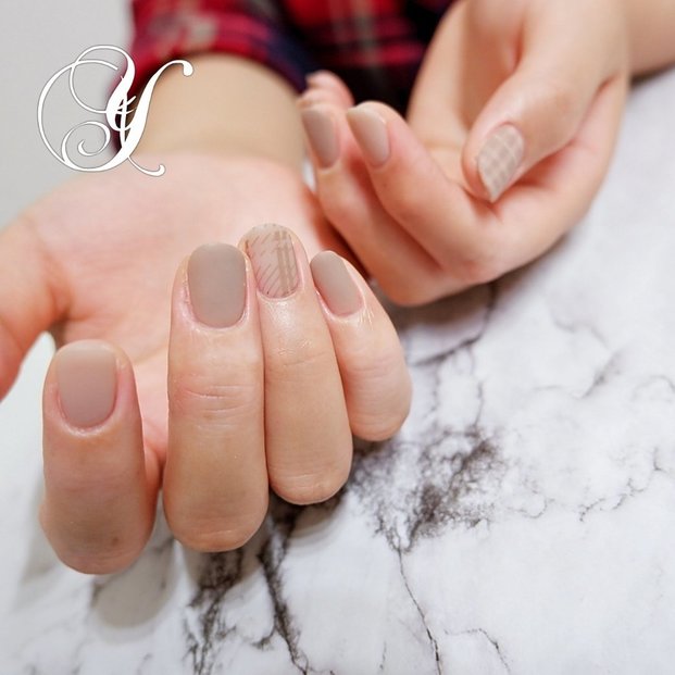 秋冬定番のチェック柄ネイルも、ショートネイルで取り入れれば主張しすぎず上品な印象に。落ち着いた印象のグレージュカラーで取り入れれば、より上品に仕上がります。マットな質感をプラスすれば、秋冬らしさも増しますね。