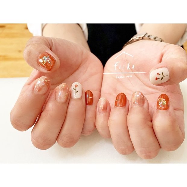 フラワーネイルデザインは、ショートネイルで取り入れることで、より可愛らしく楽しめるおすすめのデザイン。テラコッタカラーを織り交ぜれば、ヴィンテージ感のあるデザインに仕上がるのでおすすめです。