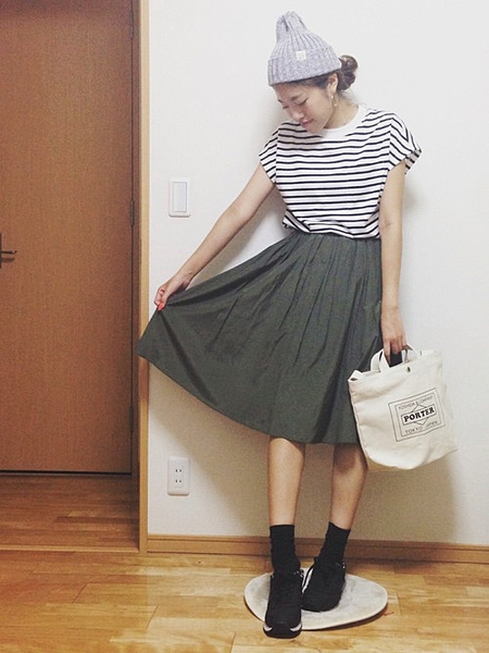 秋のトレンドカラー「カーキ」のスカート。