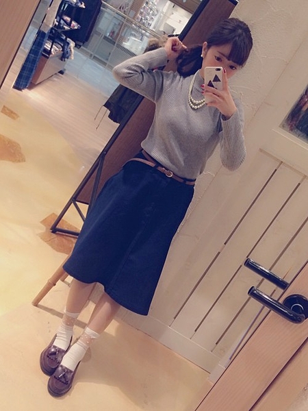 ベルト付きの可愛いミドルスカート。丈が長すぎず短すぎず丁度いい上品な女性らしいデザインに。