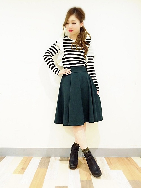 ガーリーな肩フリルと合わせて。ダークグリーンで少し大人っぽい。