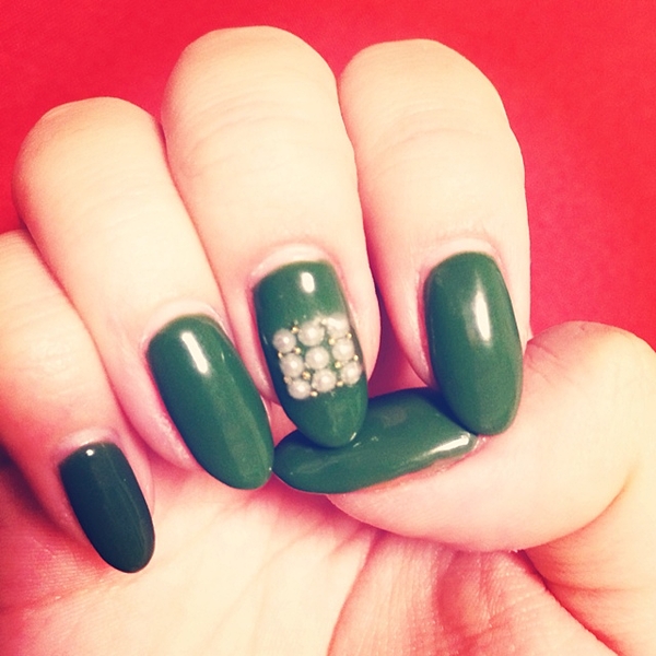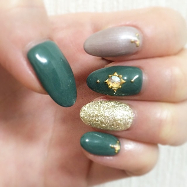 ラインストーンで結構派手目になるかと思いきや、モスグリーンの効果でバランスよく収まっています◎