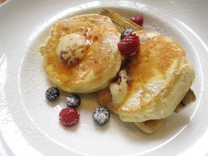 リコッタチーズのパンケーキw/フレッシュバナナ(1080)は、人気の一品。ふわふわの生地とリコッタチーズの愛称は抜群!