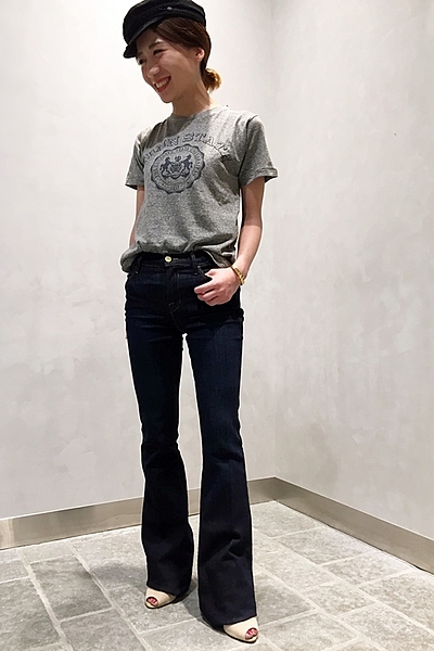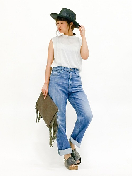 シンプルなタンクトップやTシャツに、ハットや小物で差をつけたいフレアデニム。