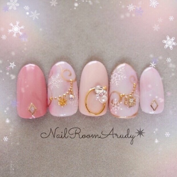 ピンクのワンカラーでガーリーなクリスマスネイルに♡指先にふわっと舞い降りる雪の結晶が、冬気分を盛り上げてくれます。